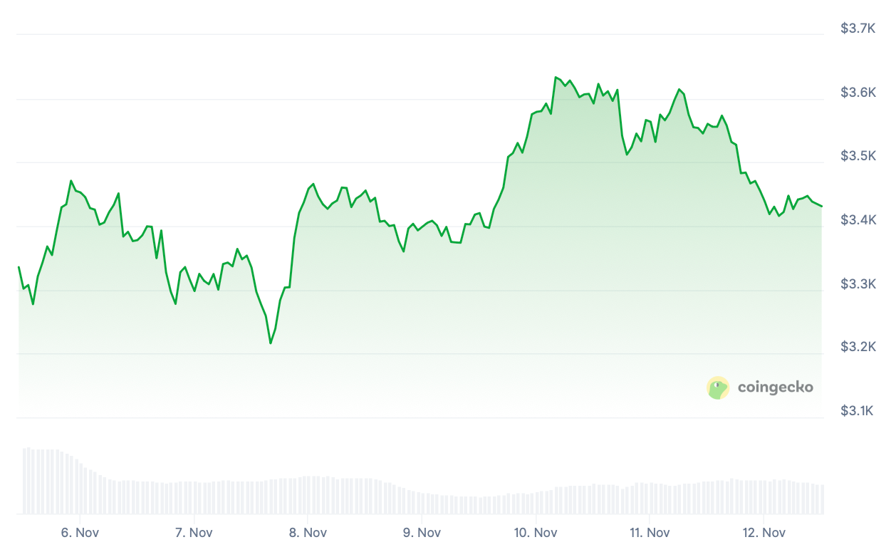 The ETH price pushed to almost $3.5k on Wednesday, November 5, and rolled back, hitting a low of $3,216.34 in two days and violently rebounding. Slipping from $3.5k again, the price regained momentum on Monday, November 10, when it peaked at $3,633.56 before a choppy decline.