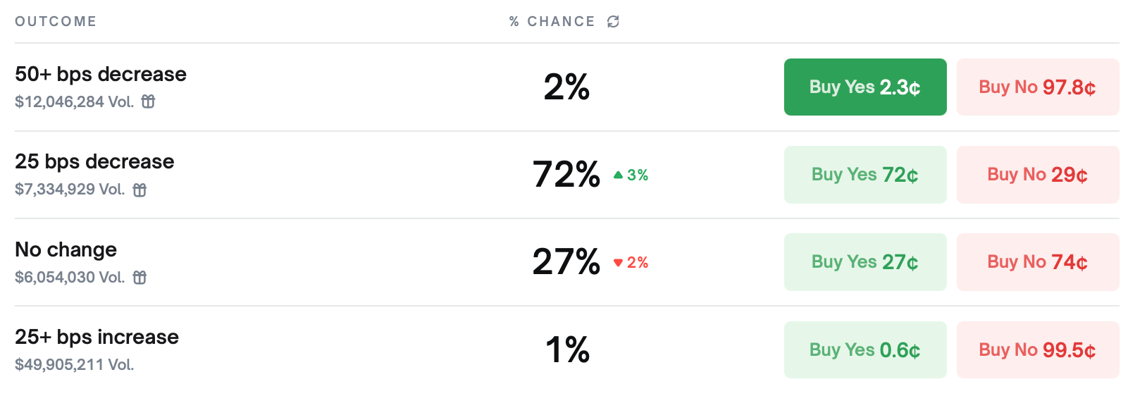 At press time, the CME FedWatch tool shows a roughly 63% chance of a December cut. Polymarket sees it slightly higher at 72%.