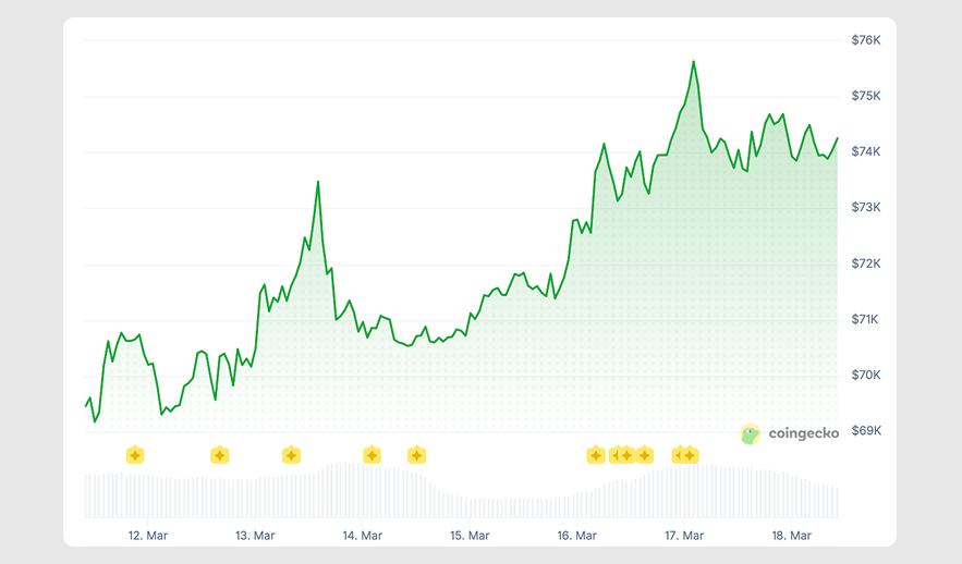 The BTC price bounced off $69k and approached $73.5k on Friday, March 13, before retreating briefly and pushing further. On Tuesday, March 17, the coin hit a 7-day high of $75,632.41, then returned to the $74k mark.