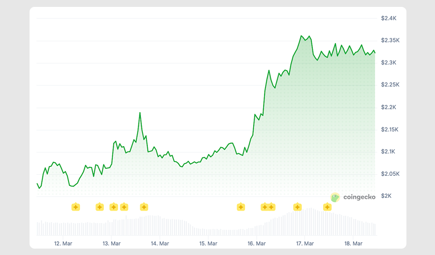 Amplifying BTC's rally, ETH surged above $2k, touched $2,188.53 on Friday, March 13, and briefly stabilized around $2.1k for two days. On Sunday, March 15, the coin jumped to $2,361.51, and has since teetered just above the $2.3k mark.