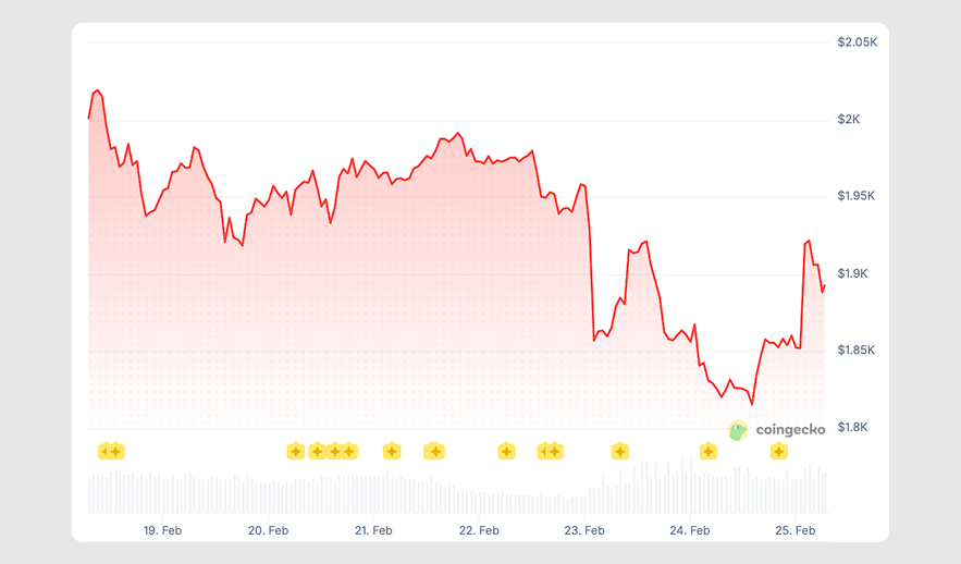ETH followed BTC closely through the week, initially plunging below $2k to $1,918.56 on Thursday, February 19, and failing to recover. On Monday, February 23, it plunged to $1,862.92, managed a brief uptick, and sank deeper to $1,815.54 the next day before rebounding.