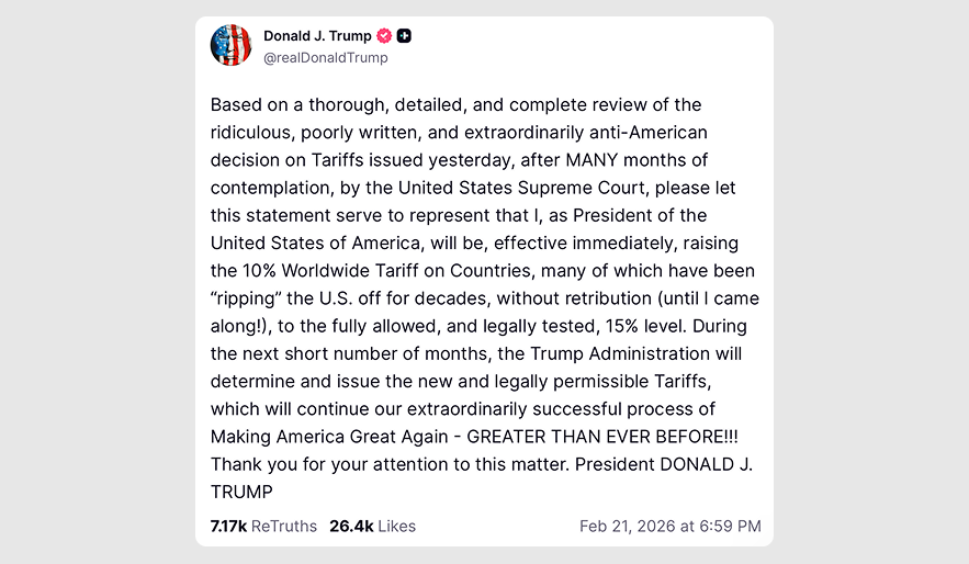 Over the weekend, Trump raised a proposed global tariff rate from 10% to 15% via a Truth Social post, days after the US Supreme Court struck down his earlier emergency tariffs. He quickly moved to reinstate them under Section 122 of the Trade Act of 1974, citing balance-of-payment concerns.
