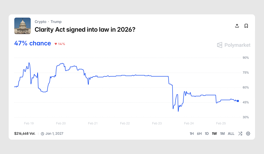 The probability of the CLARITY Act — the long-awaited bill creating a federal framework for digital assets — becoming law this year has fallen below 50% on Polymarket, down from over 80% just last week. In a single day, the odds cratered from 72% to 42%, signaling that market confidence in a near-term resolution is rapidly evaporating.