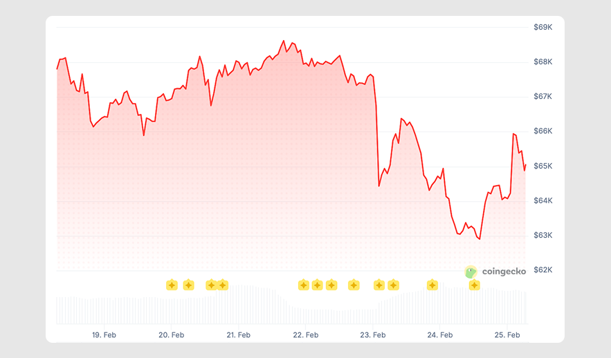 The BTC price dipped from $68k to $65,893.78 on Thursday, February 19, and reversed to a high of $68,624.36 as the weekend began. On Monday, February 23, it sank sharply from $67.5k to $64.5k, edged up, and dipped again before bottoming at $62,905.75 the next day.