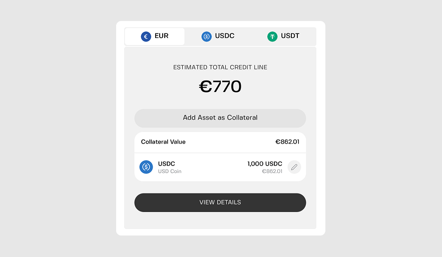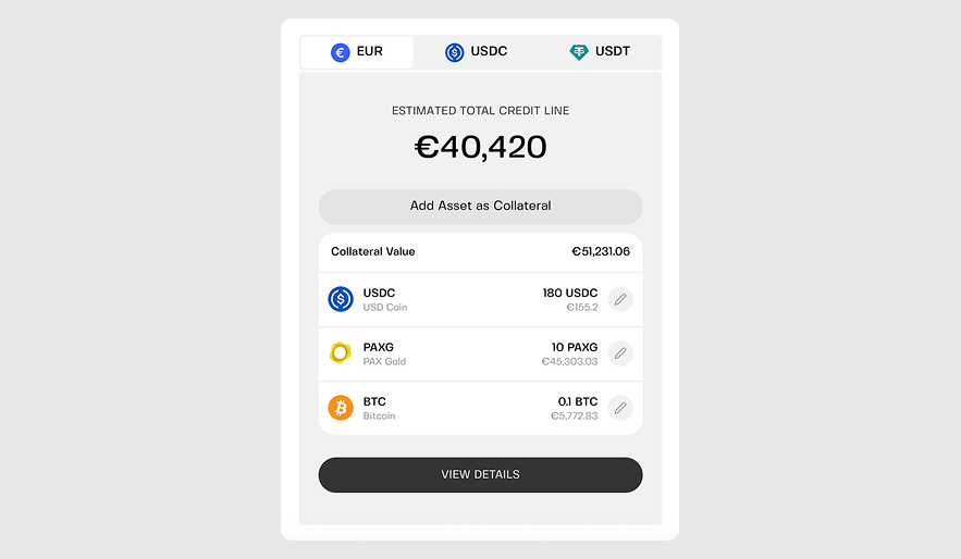 A crypto credit line lets you borrow against your digital assets by using them as collateral. Instead of selling BTC, ETH, or other holdings, you deposit them into a secured account and receive access to stablecoins (like USDC or USDT) or fiat currency