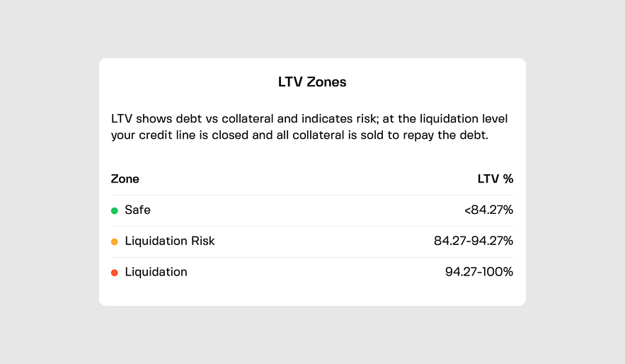 Repay on your own schedule. Add or remove collateral anytime to manage your LTV ratio and optimize borrowing costs.