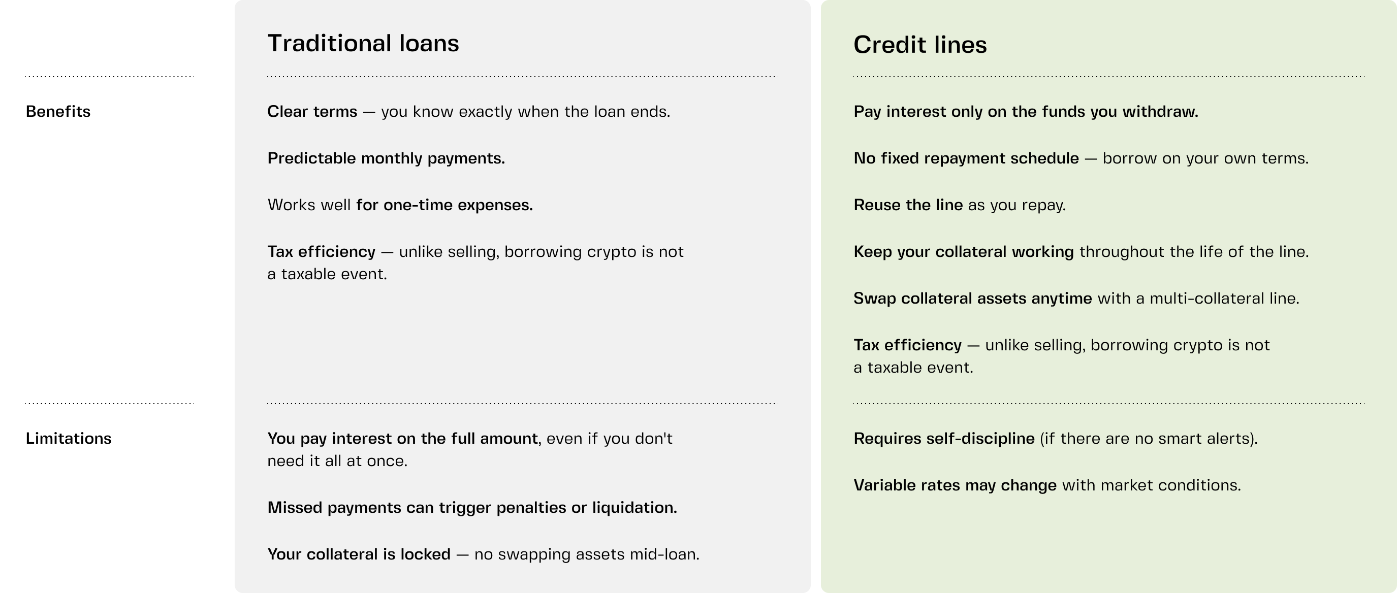 - Traditional crypto loans might be your fit if you have a specific one-time expense in mind, prefer knowing exactly when your debt will be paid off, and don't mind locking your collateral away until then. It's predictable and structured.