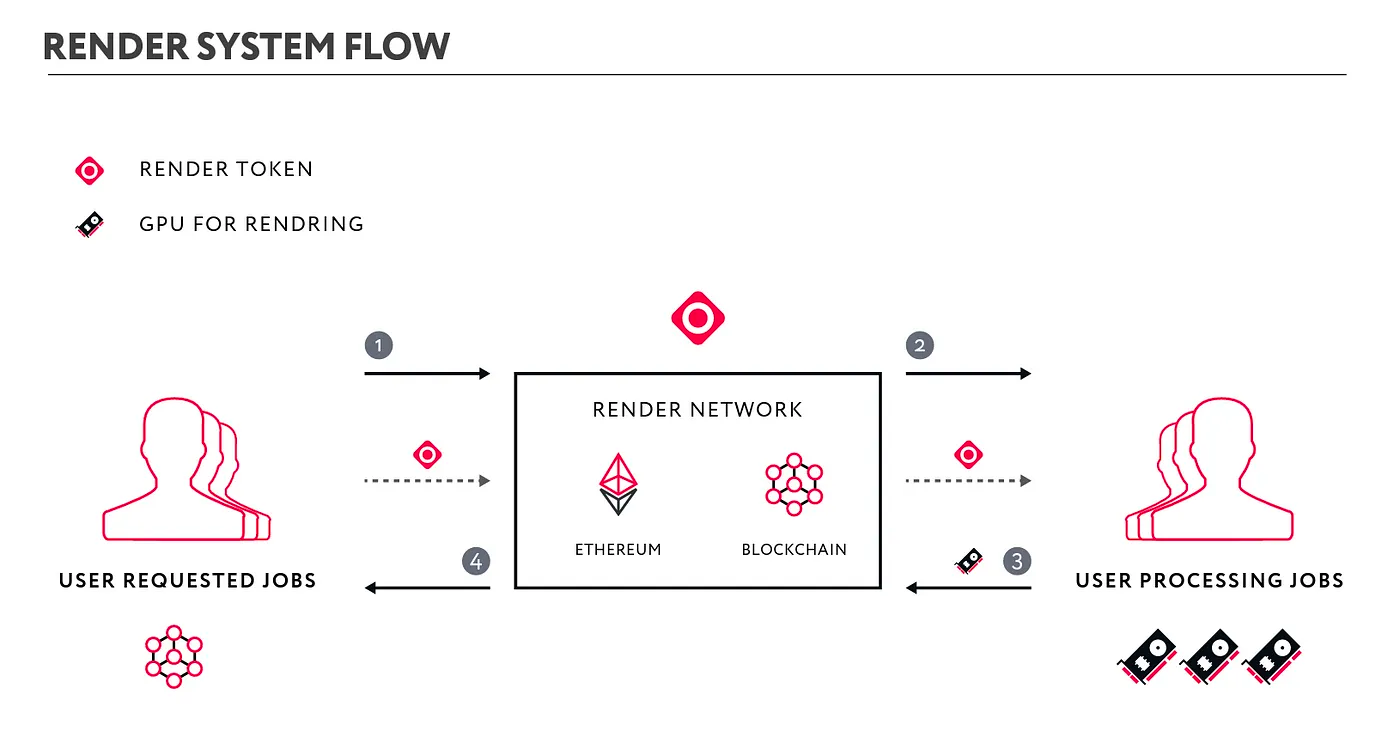 - Job distribution & processing: The rendering workload is spread across multiple, independent nodes (node operators) globally for high-performance rendering.