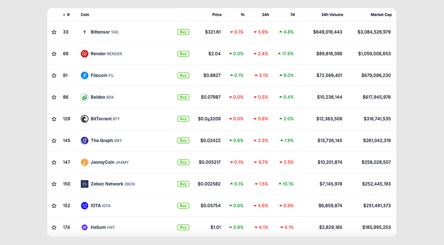 Beyond Render, several other DePINs have climbed the ranks. Here are the five biggest players right now, based on market cap.