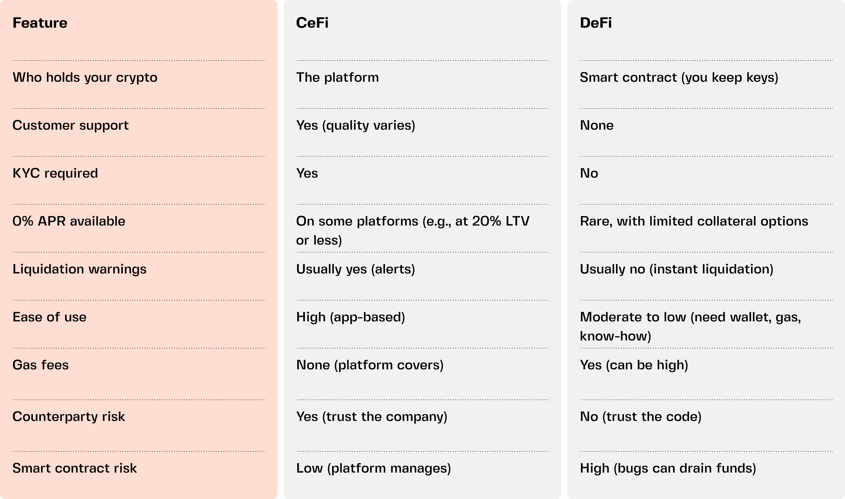 For conservative borrowers, CeFi's 0% APR is hard to beat. For those willing to shop around, DeFi can offer competitive rates — but with more volatility.