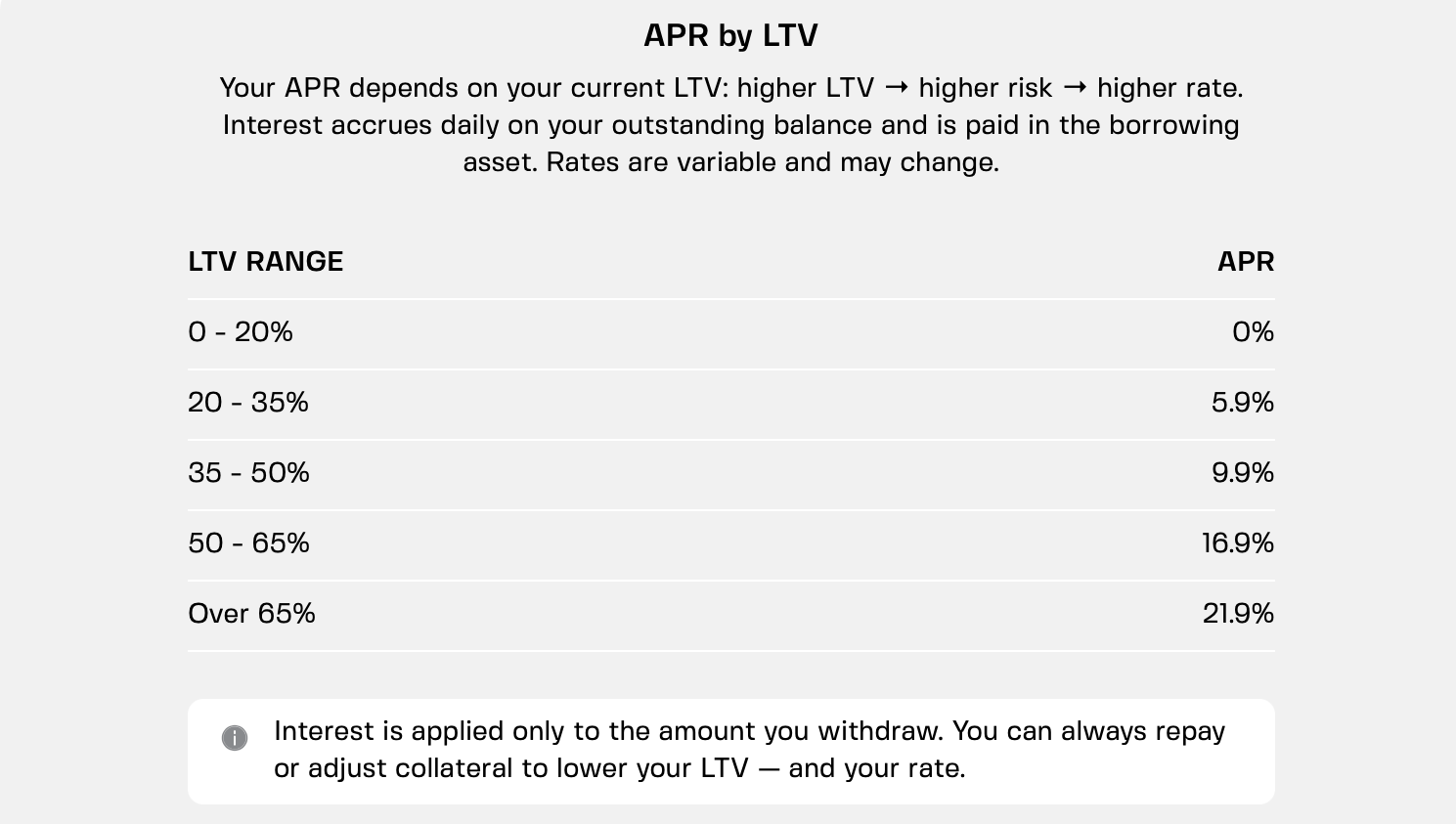 APR (Annual Percentage Rate) — the actual cost of borrowing — scales directly with LTV. The safer your position, the less you pay. Rates typically range from 0% to over 20% APR depending on how much risk you're taking.