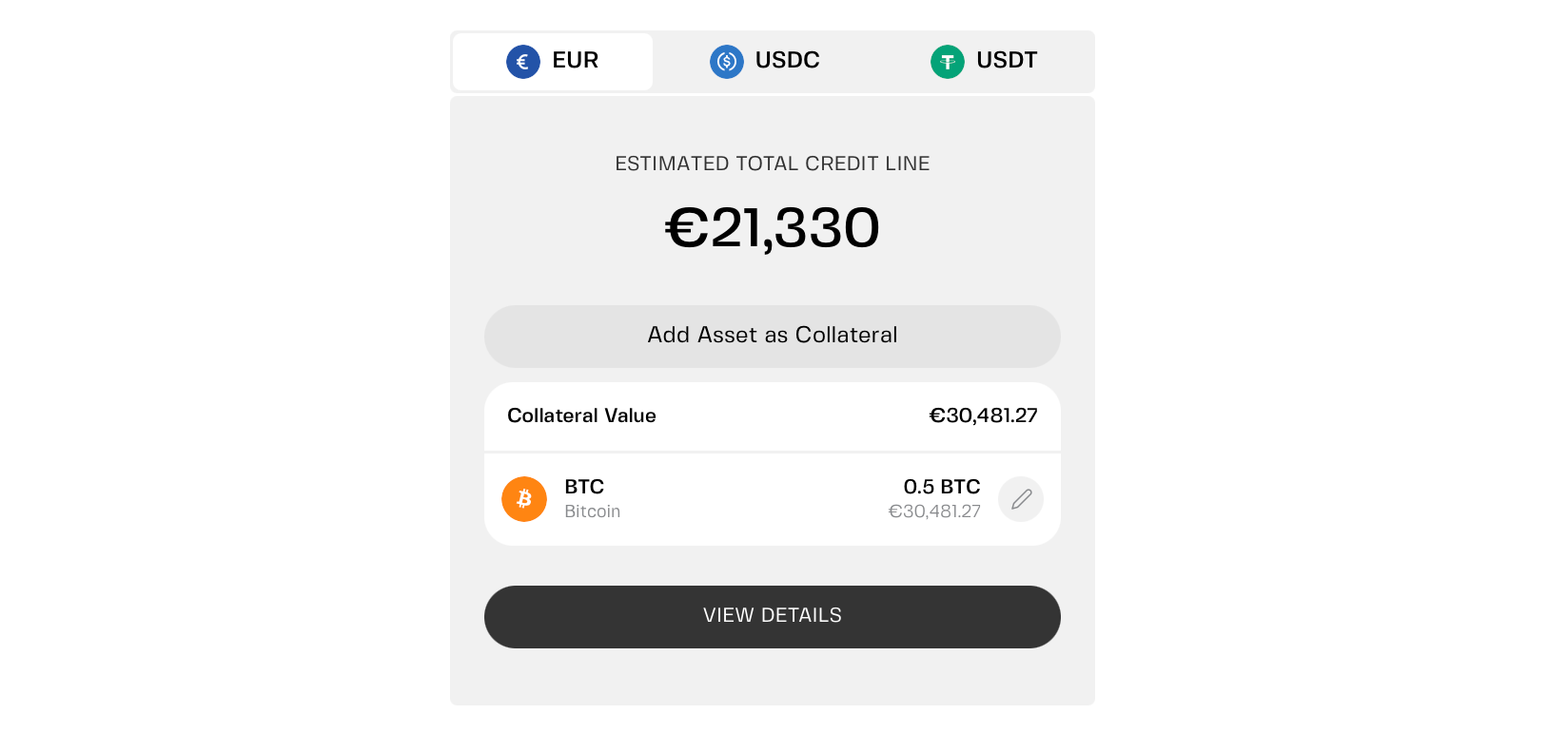 - Deposit crypto as collateral and choose your borrowing currency — fiat or stablecoins. The platform shows your estimated credit line. In this example, pledging 0.5 BTC (market value €30,481) unlocks €21,330.