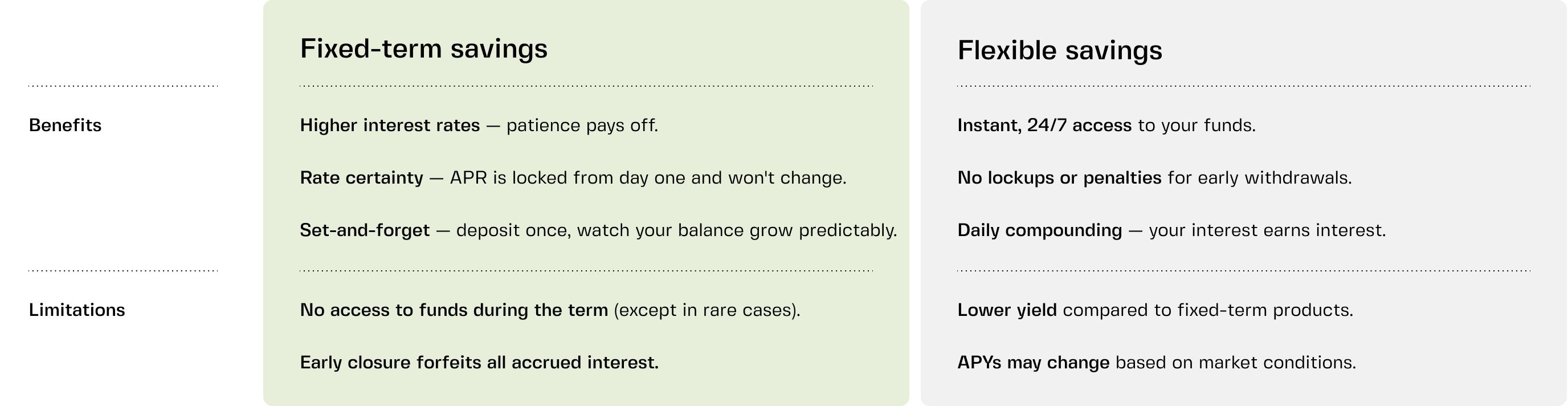 Fixed-term savings lock your funds for a set period — usually 1, 3, 6, or 12 months — in exchange for a higher, guaranteed yield. Flexible savings let you withdraw your funds at any time, with no penalties, but the interest rate is typically lower. Many people use a combination of both: fixed-term for long-term growth and flexible for liquidity and emergency access.