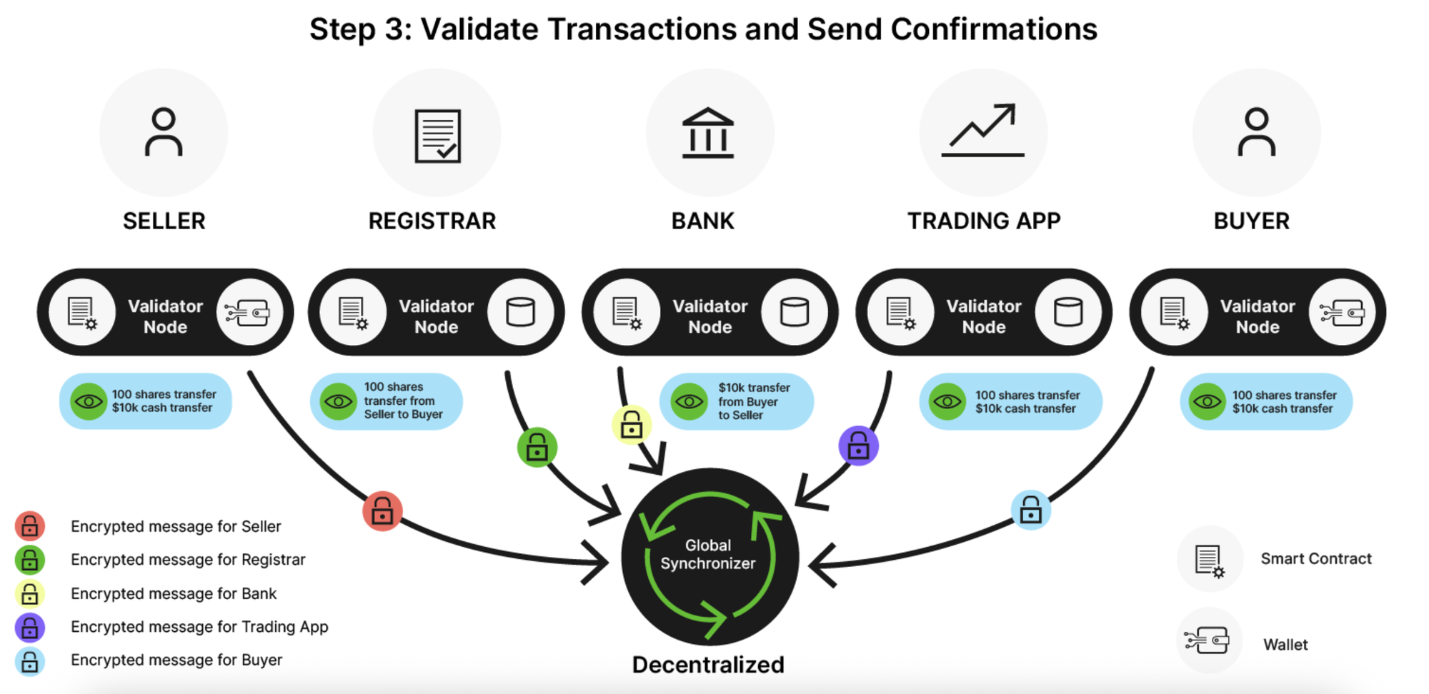 The example below depicts a Delivery vs. Payment (DvP) transaction, where an asset (100 shares) is exchanged for payment ($10k). The seller, registrar, bank, trading app and buyer must all validate the transaction for it to succeed.