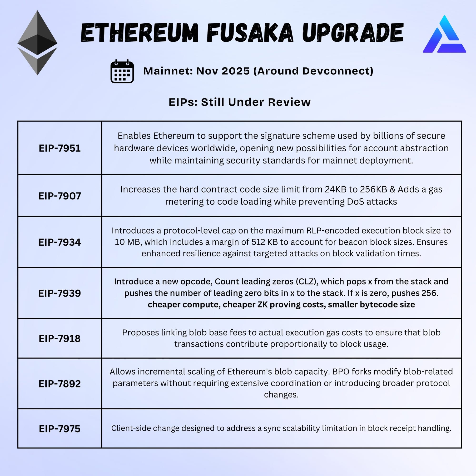 Fusaka also includes bigger smart contract limits, new opcodes, and broader cryptographic support.