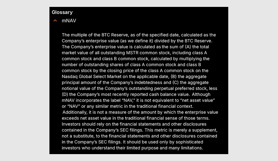 The critical pressure point is mNAV (market-to-net-asset value). This measures how much investors are willing to pay above the value of Strategy’s Bitcoin holdings. mNAV is calculated as the company's enterprise value divided by the market value of the BTC reserve.