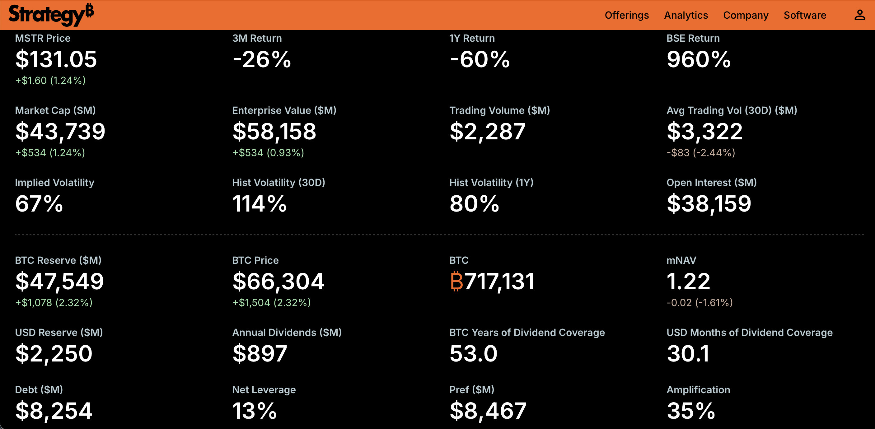 Currently, with BTC hovering around the $66,000 mark, the company's Bitcoin reserves are worth roughly $47.4 billion, as opposed to a net debt of $6.0 billion.