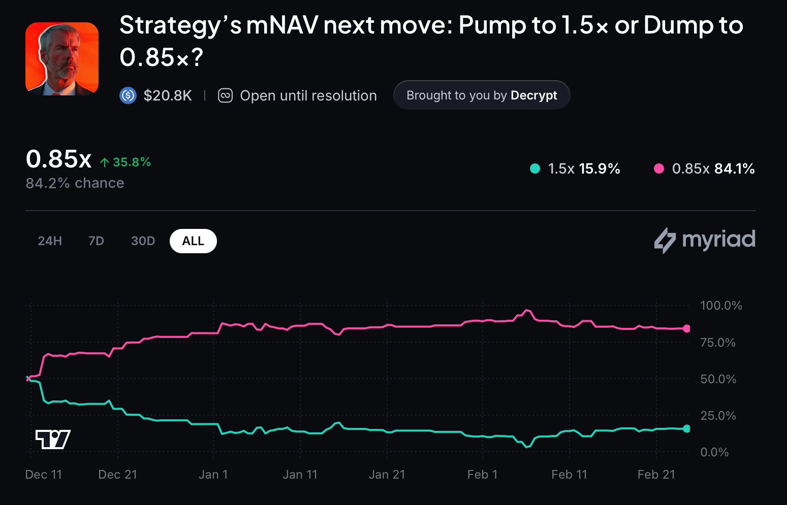 Yet on Myriad, over 84% of bettors consider a dip to 0.85x more likely than a rise to 1.5x.