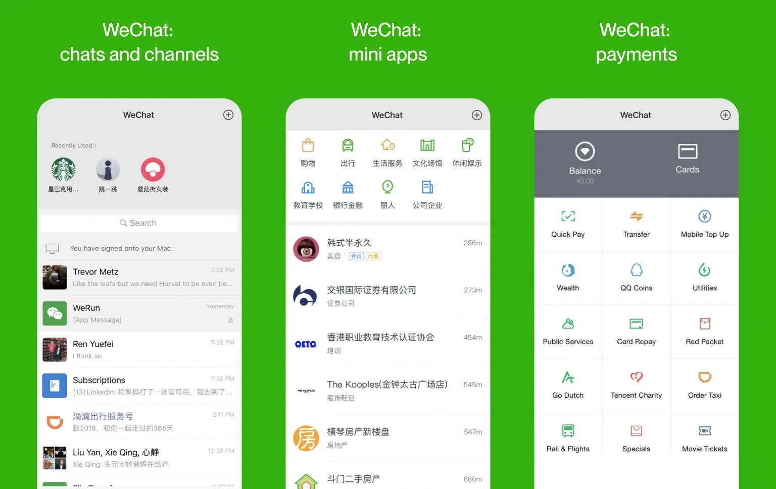 Those mini programs let developers build lightweight applications that require no installation and update themselves over the air. WeChat now processes over 74% of China's mobile payments and touches more than 200 industries — from food delivery to government administrative tools.