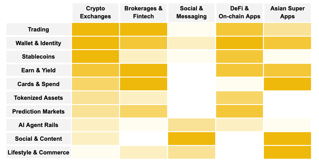 While large CEXs have an early advantage, the super app model remains open, with fintechs, social platforms, and on-chain ecosystems all competing for different parts of the stack.