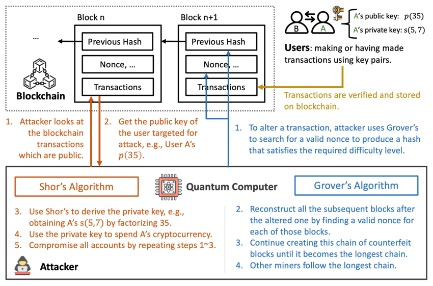 - Snatching those keys and feeding them through a quantum computer using Shor’s algorithm to unlock the private keys.
