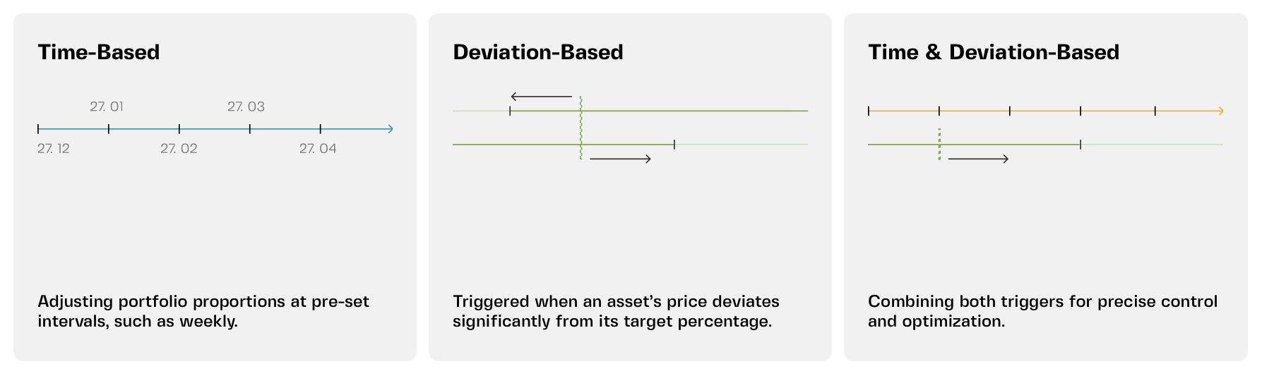 - Time & deviation-based: Combine both methods — check allocations at regular intervals but only rebalance if deviations exceed a predefined threshold. This balances efficiency with precision.