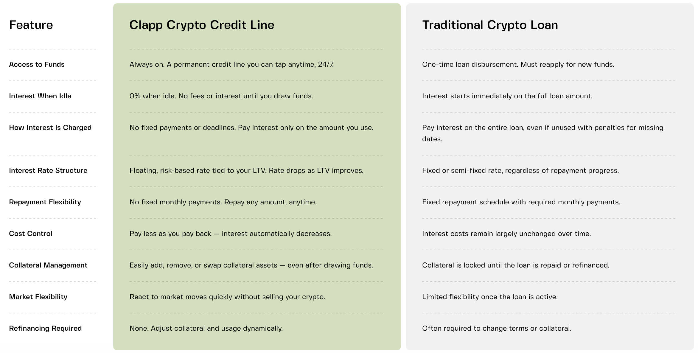 - Crypto credit line: A revolving facility that allows repeated borrowing up to a limit, without fixed monthly payments or loan terms.