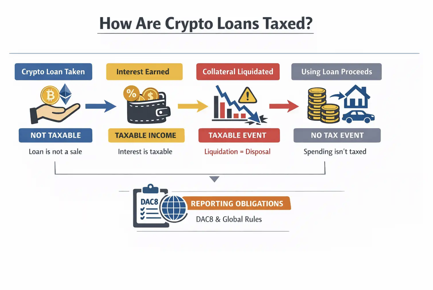 Borrowing against crypto is generally not a taxable event, but taxes can arise depending on how the loan is used and how it ends.