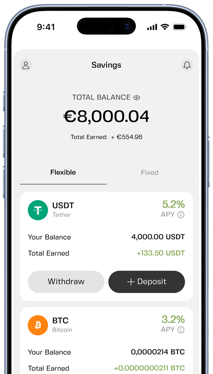 Wealth building shouldn't have a barrier to entry. Forget the high minimum deposits of private banking. Start earning interest with as little as 10 EUR, USDC, or USDT and watch your savings grow from day one.